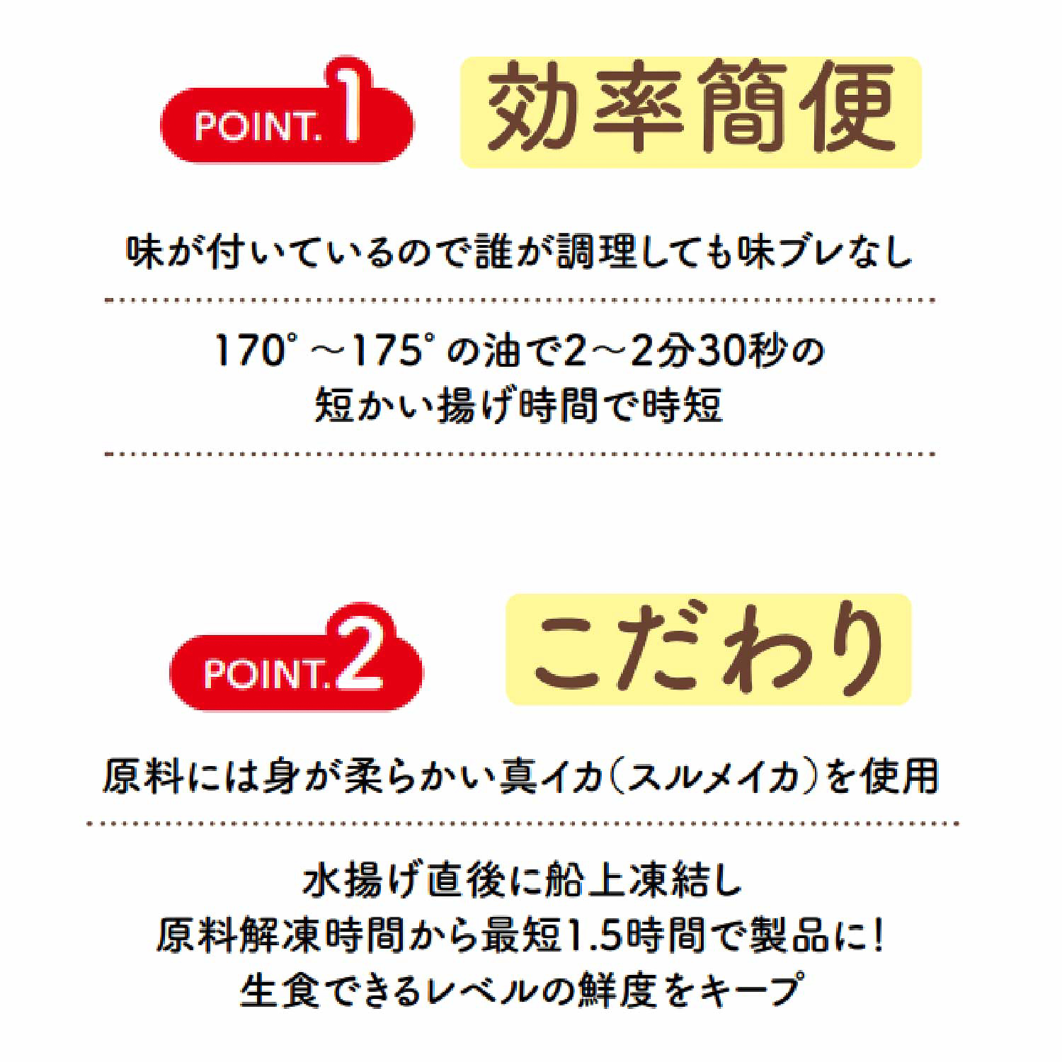 特長 原料に真いかを使用して薄衣で仕上げました。冷めてもやわらかい食感のいか唐揚げです。