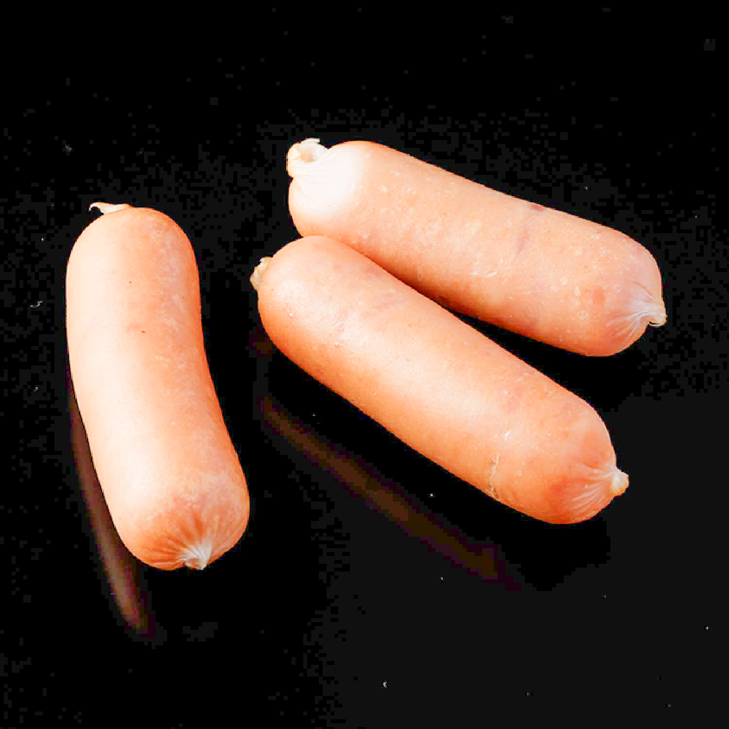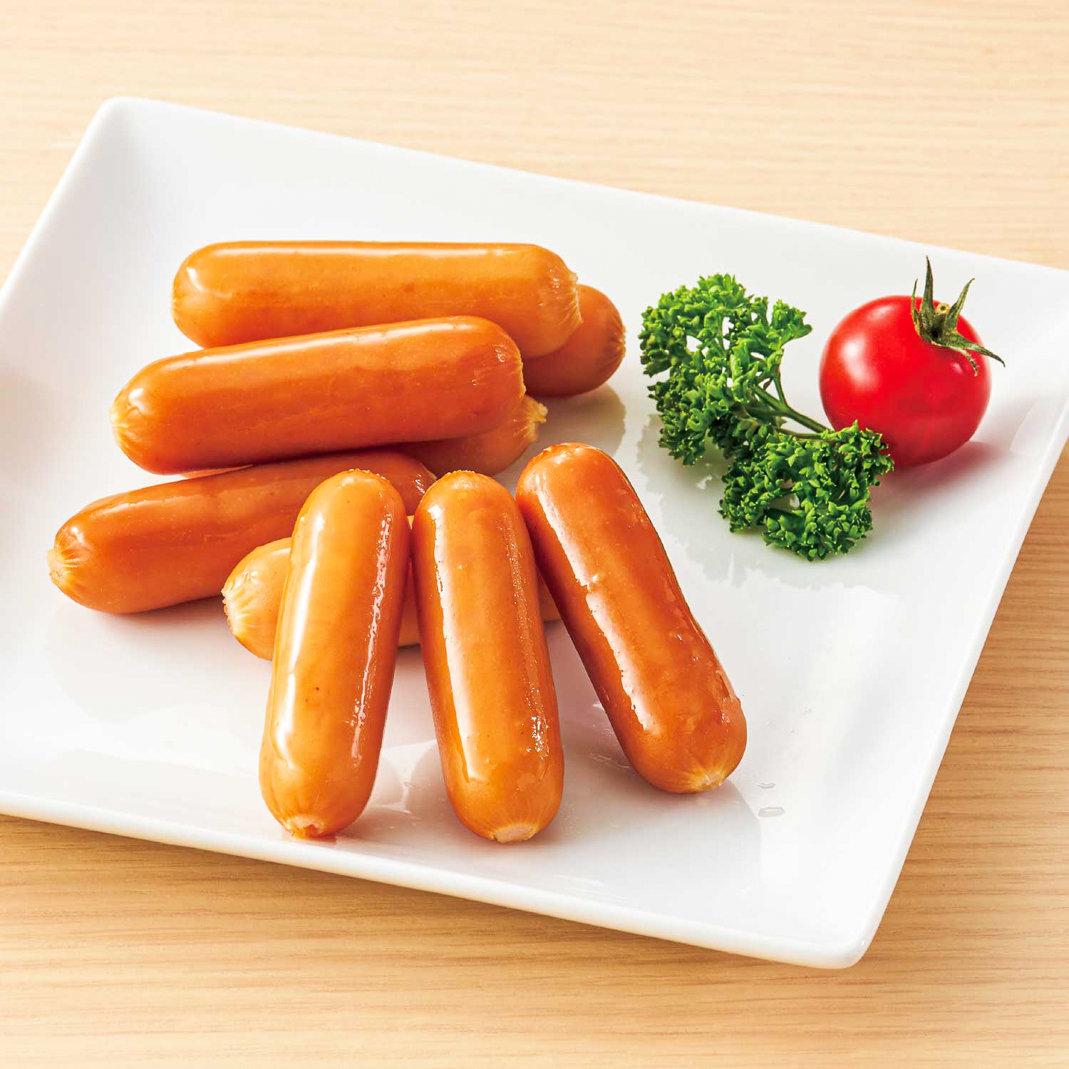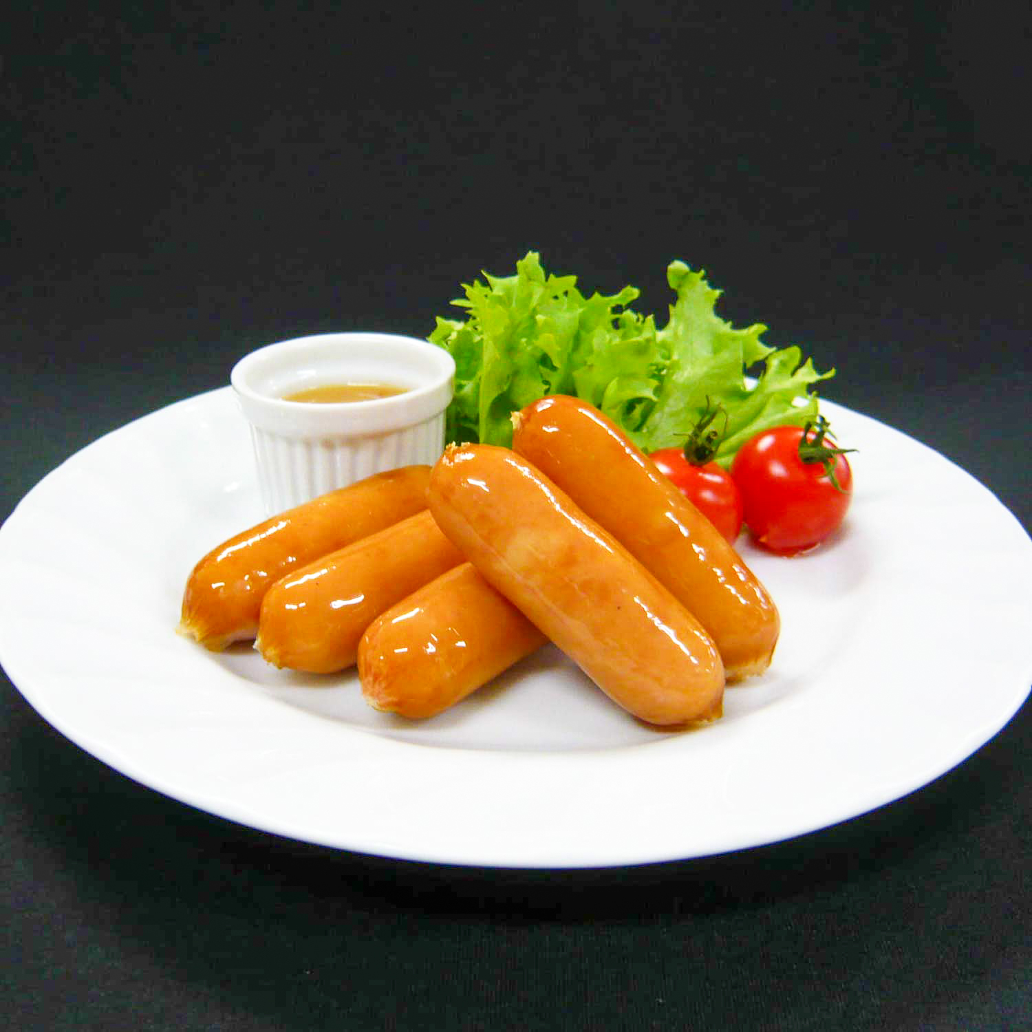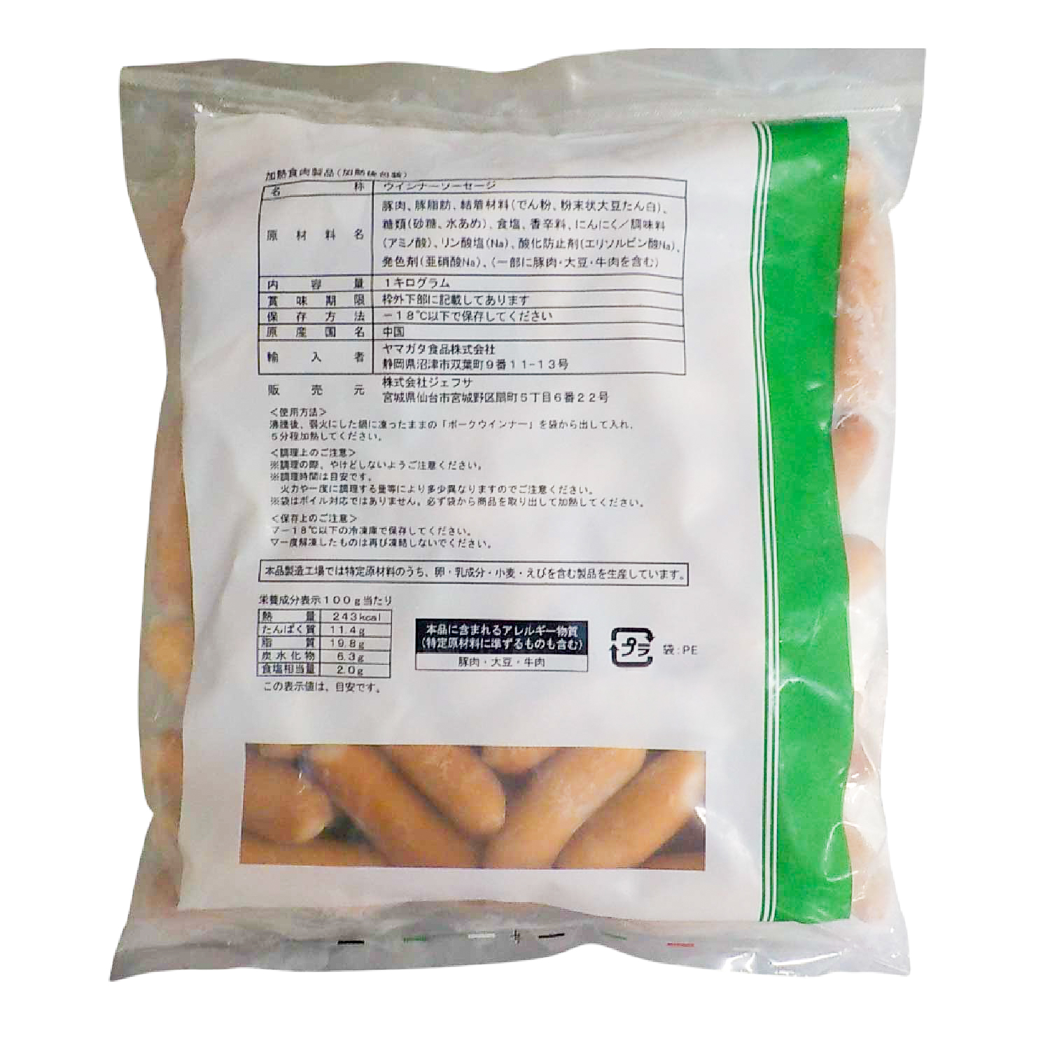特長 肉は豚肉のみを使用。8mmで粗びきに挽いた後、その他 原料と混ぜてコラーゲンでケーシングしたソーセージ。