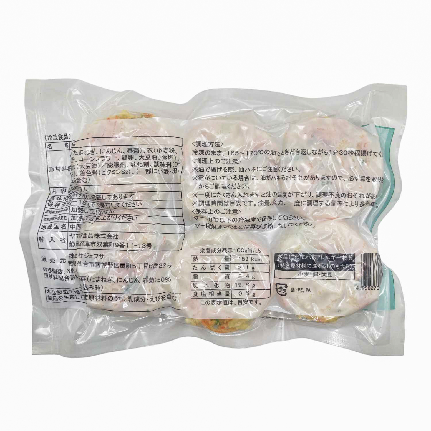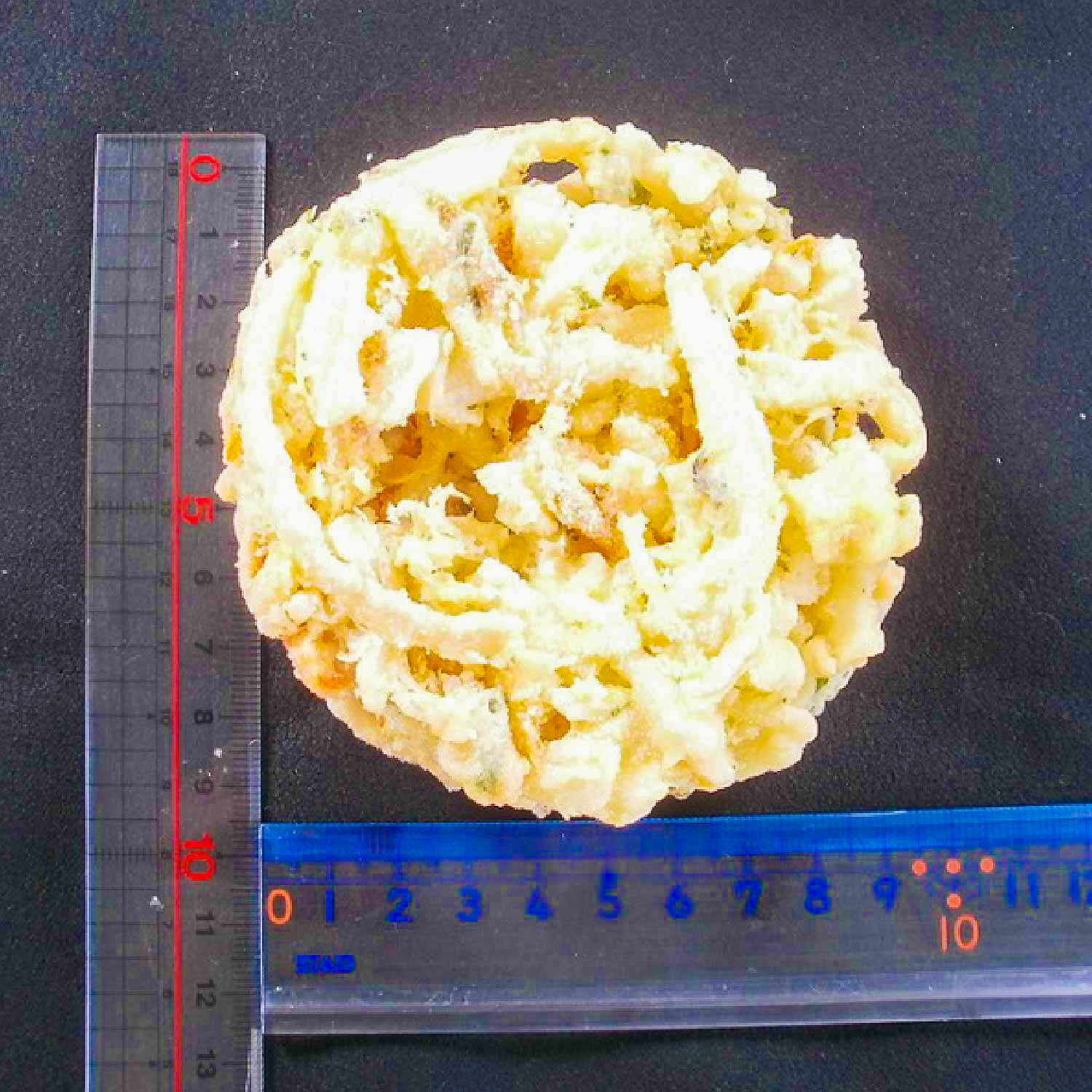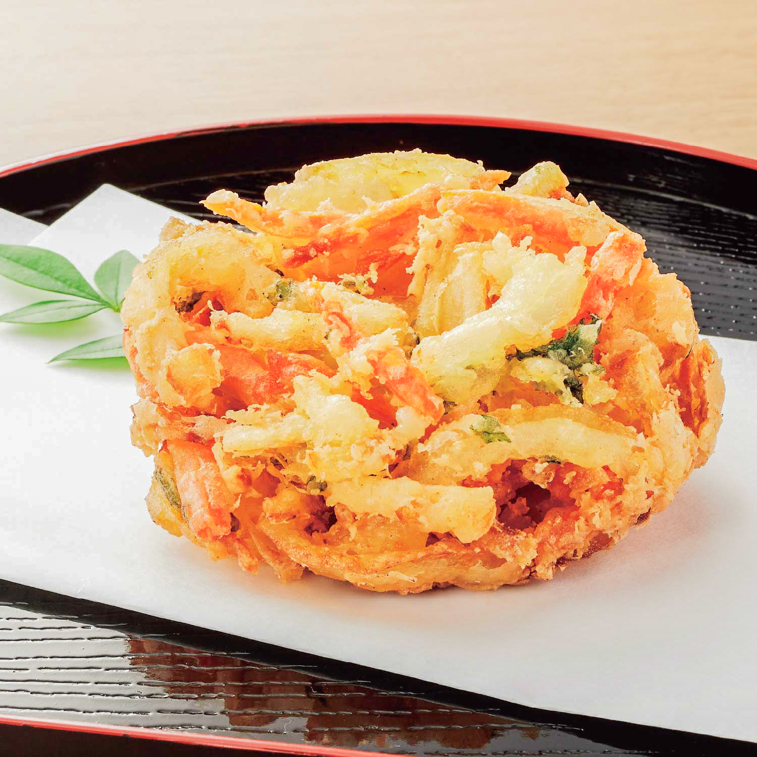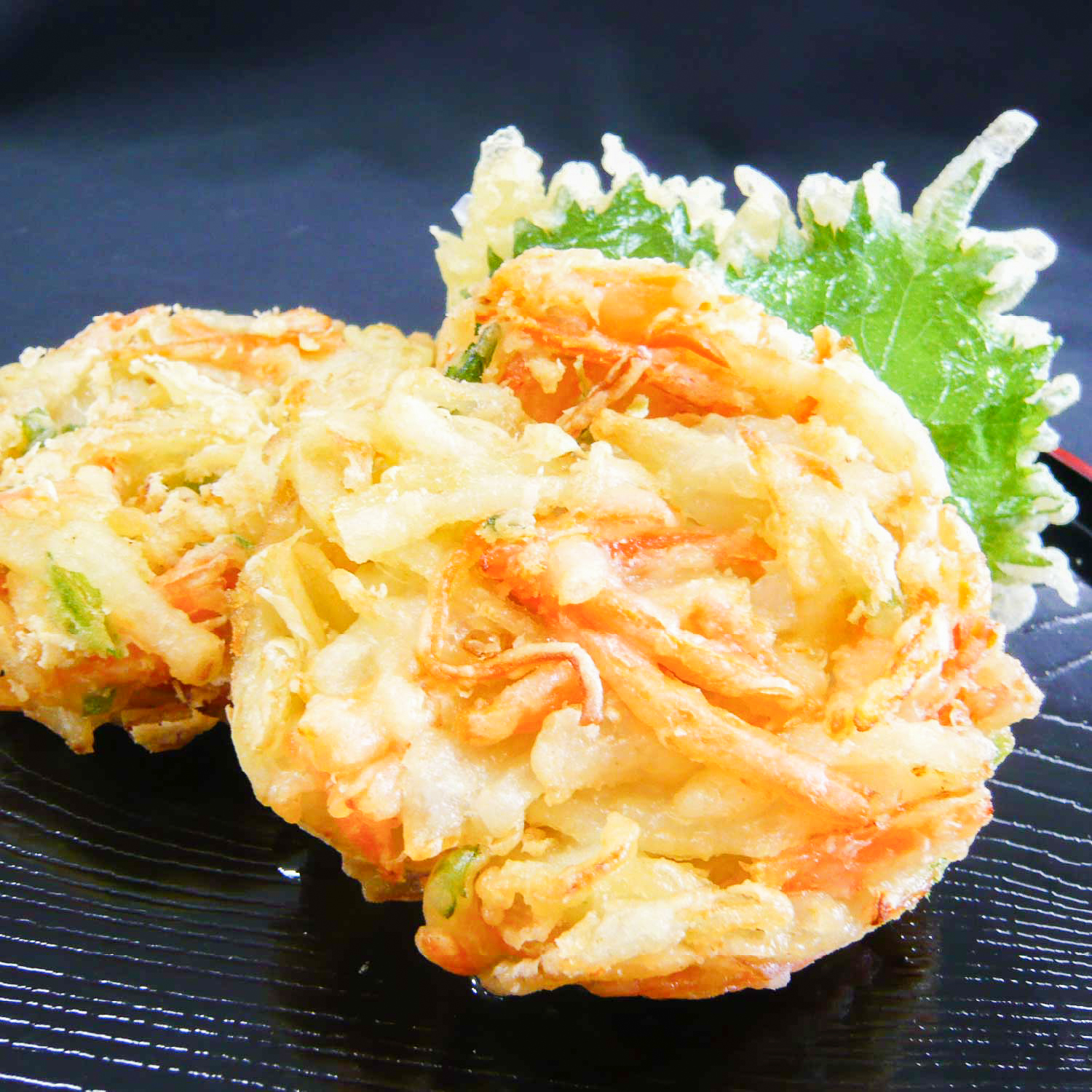 特長 たまねぎ、にんじん、春菊を使い、彩り良く仕上げた かき揚げです。野菜の甘さとサクッとした食感が特徴。