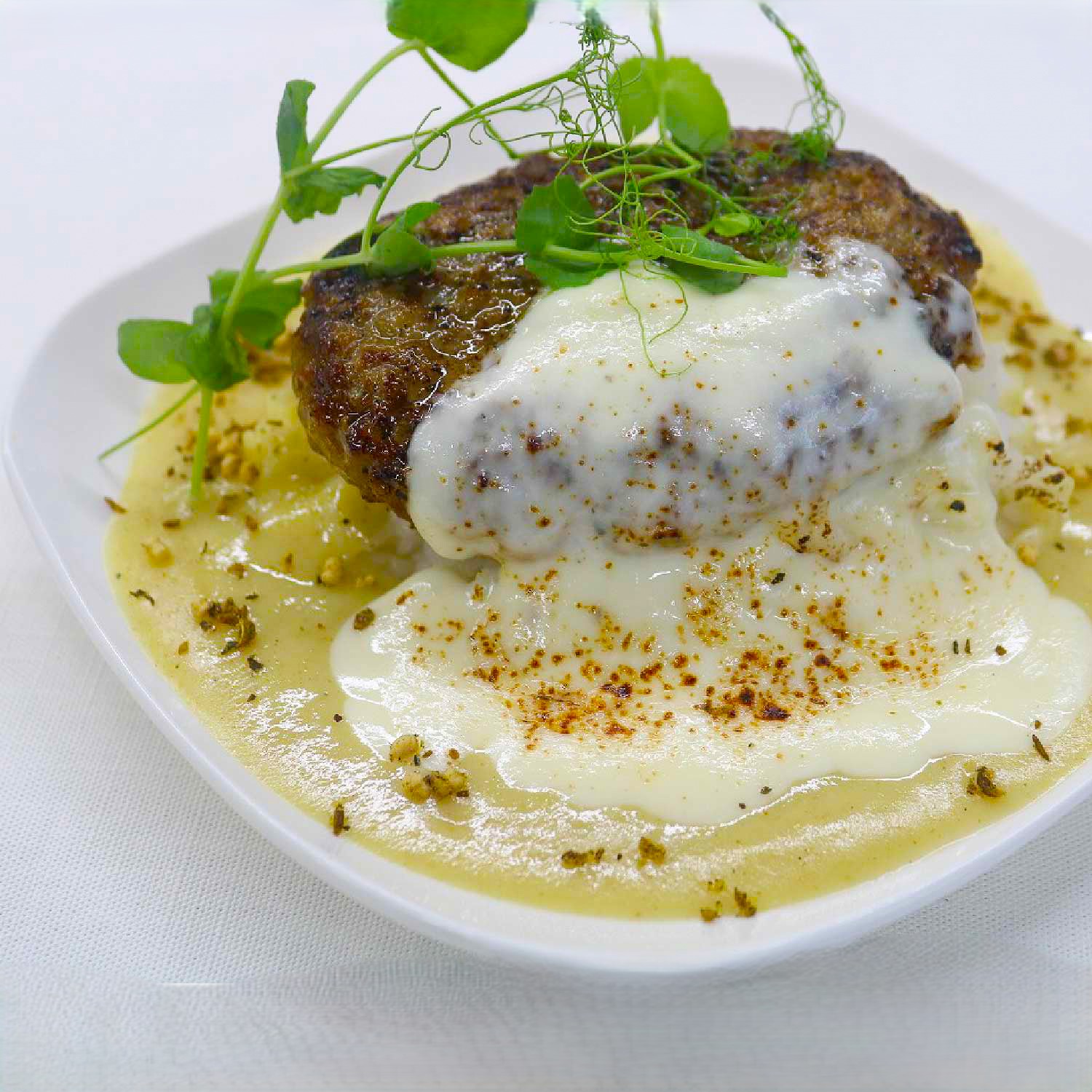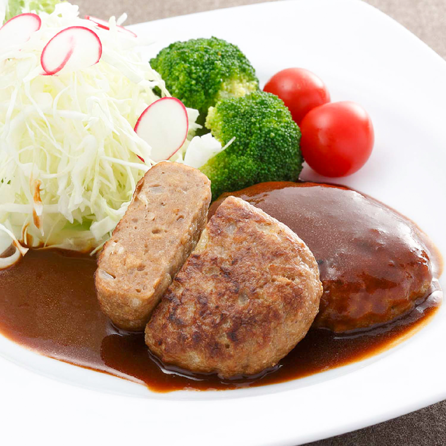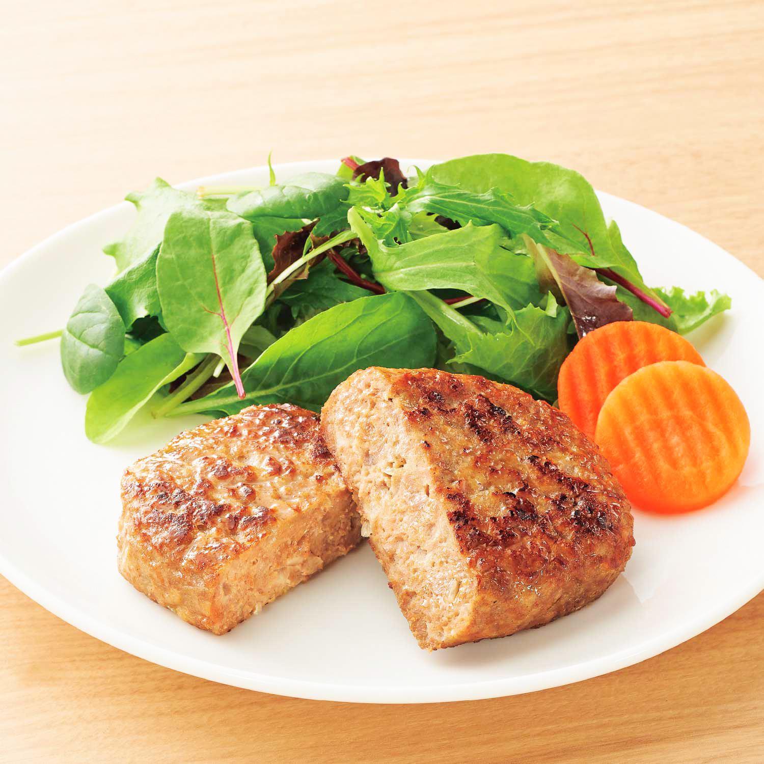 特長 ハンバーグ自体の形状を工夫し、盤面が大きくなるようにしました。肉粒感が感じられるように仕上げました。