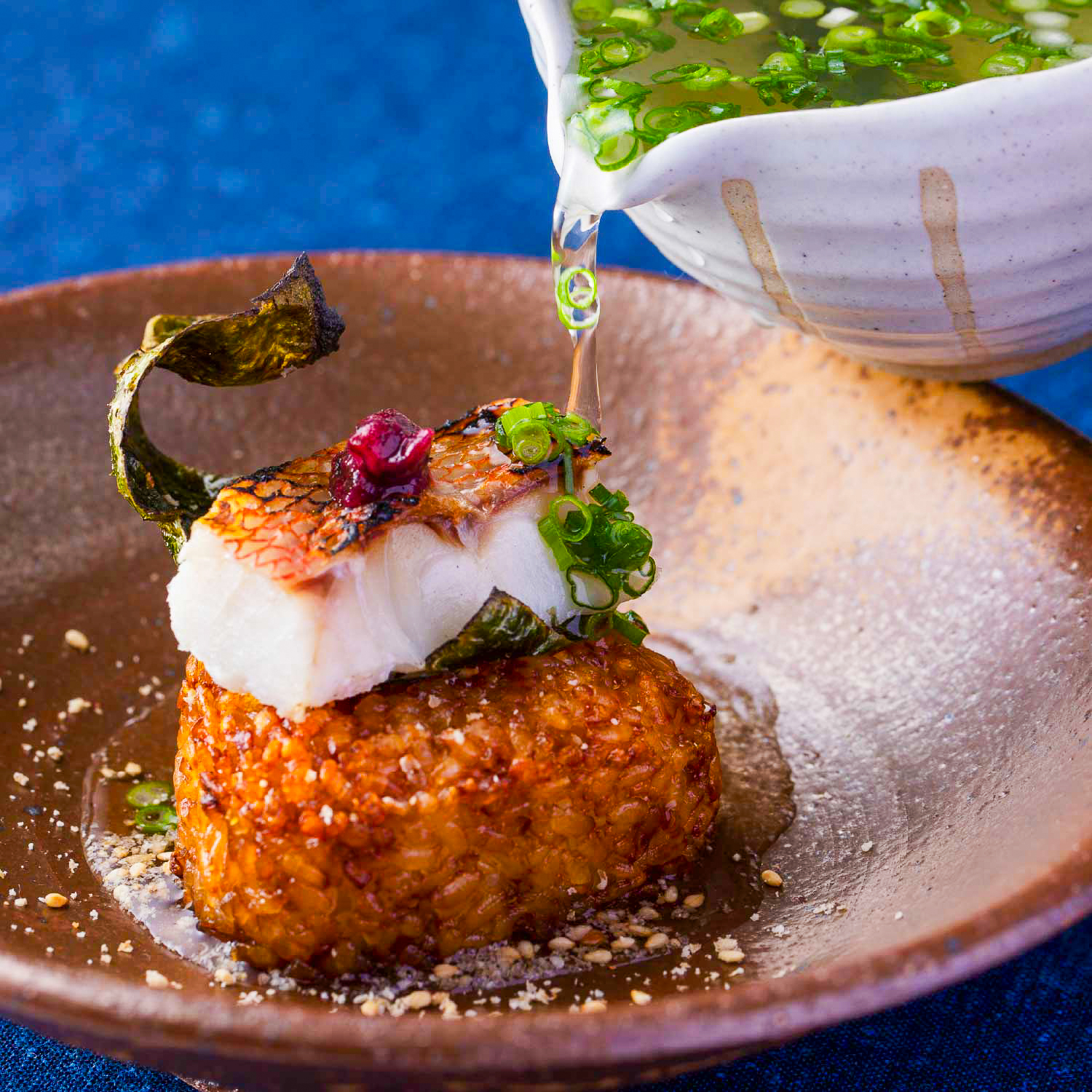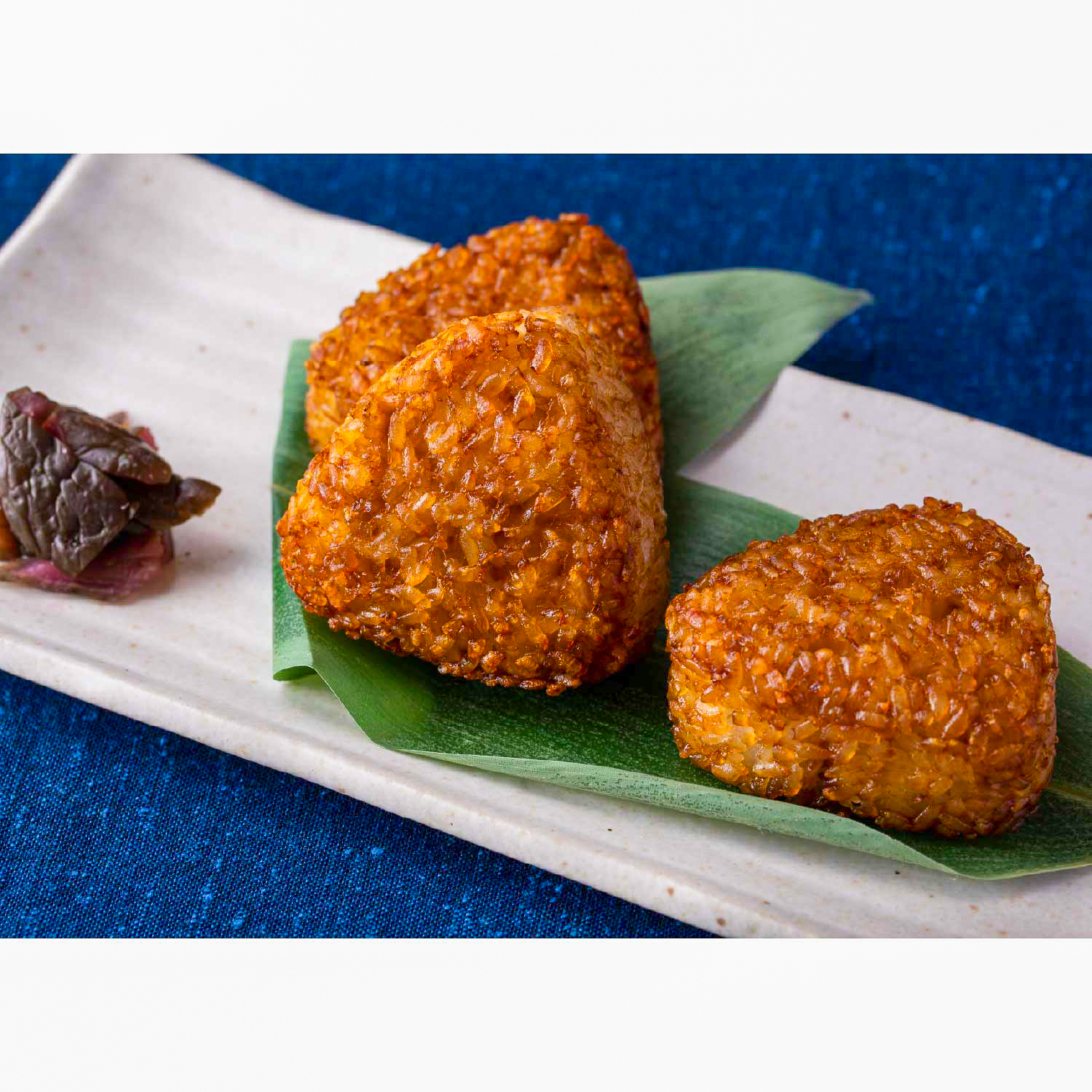 特長 昆布だしとかつおだしの風味を効かせた白飯のおにぎりに 濃厚な醤油を塗り直火で焼き目を付けました。
