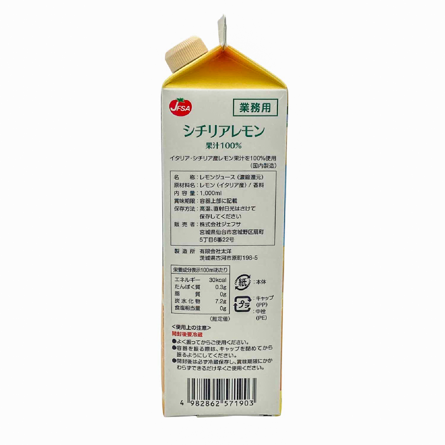 特長 シチリア産レモン果汁100%製品。割り材や料理の酸味付け、製菓材料等幅広くご使用いただけます。