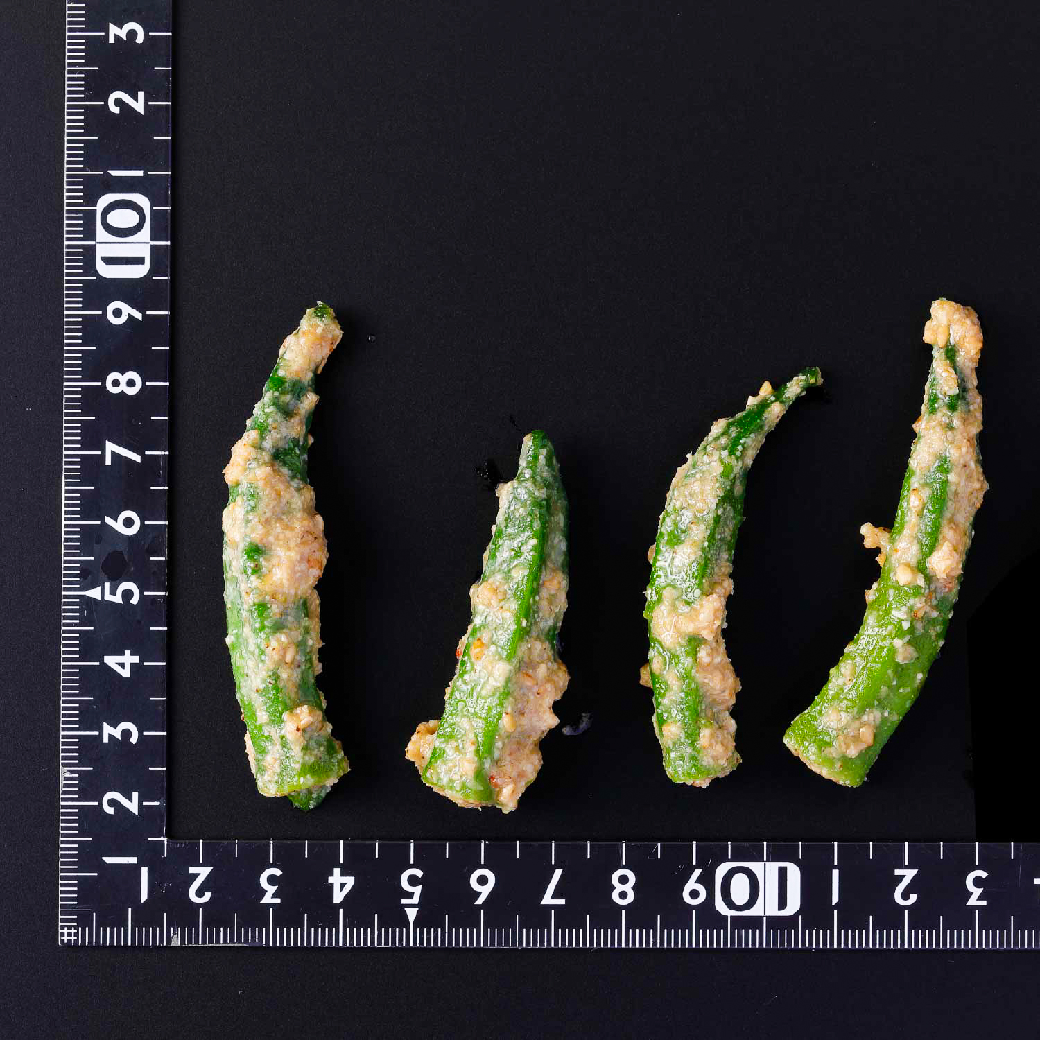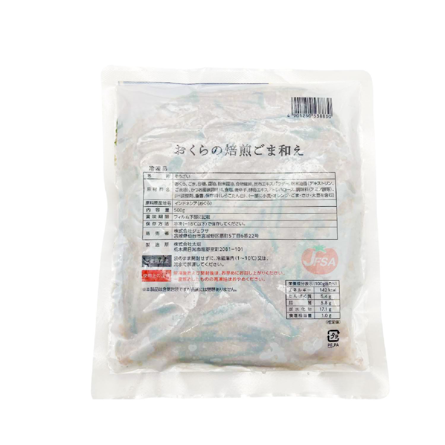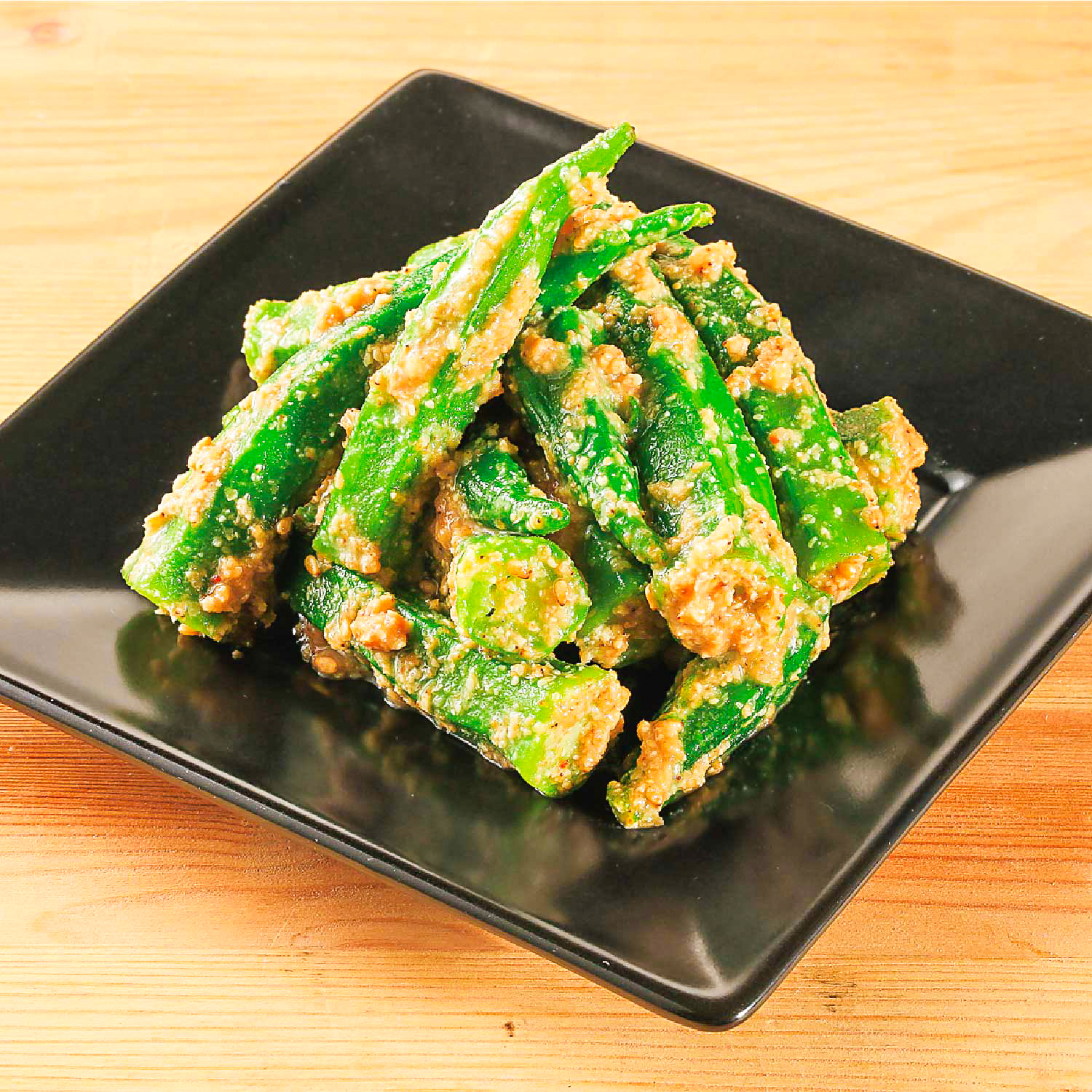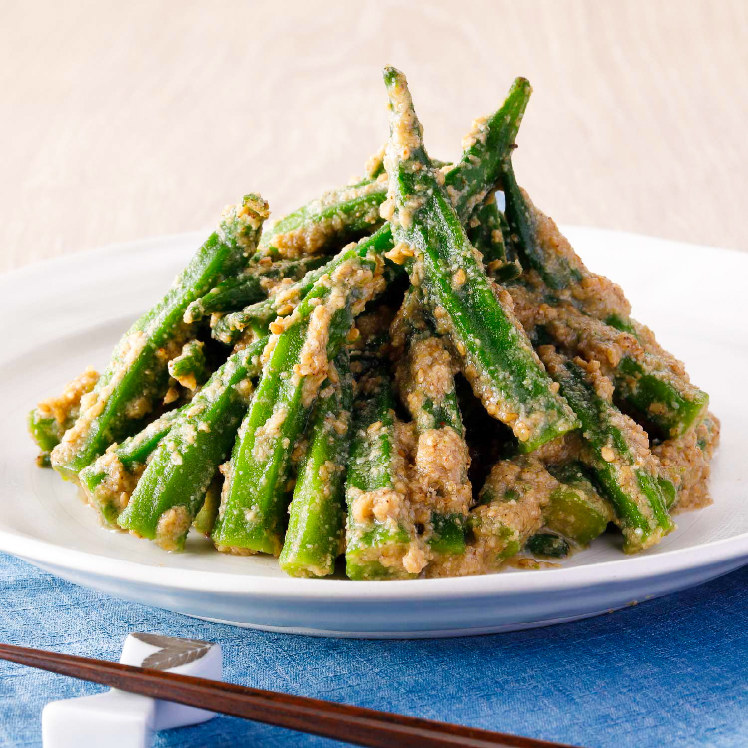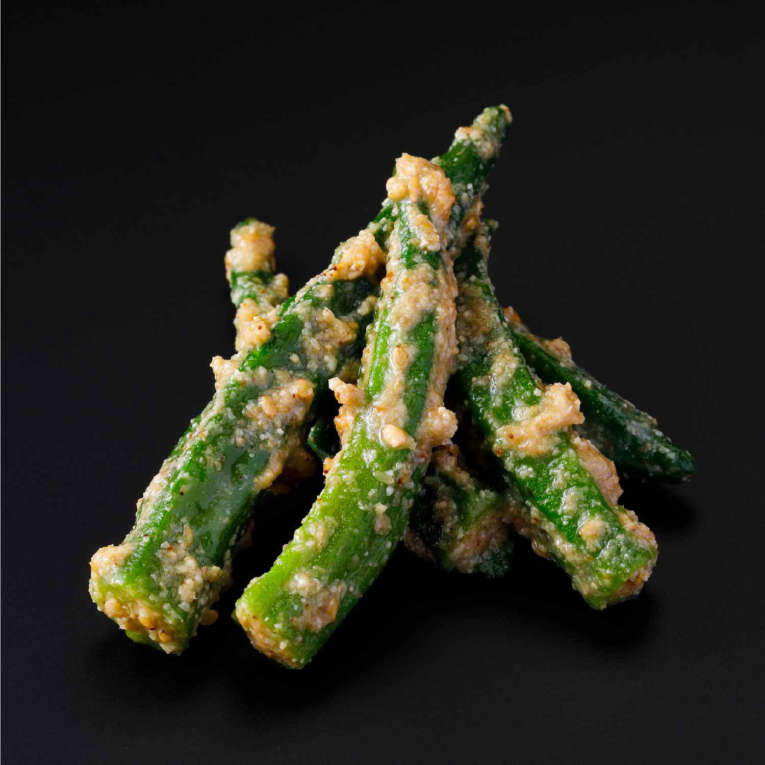 特長 一本物のおくらにかつおと昆布のだしで下味をつけ、焙煎した胡麻の香り豊かに仕上げました。